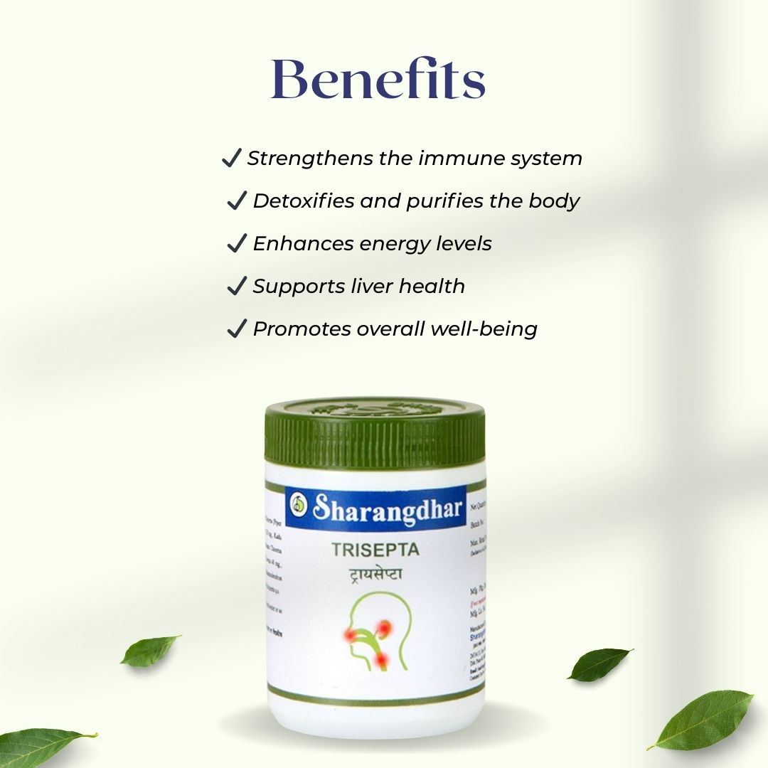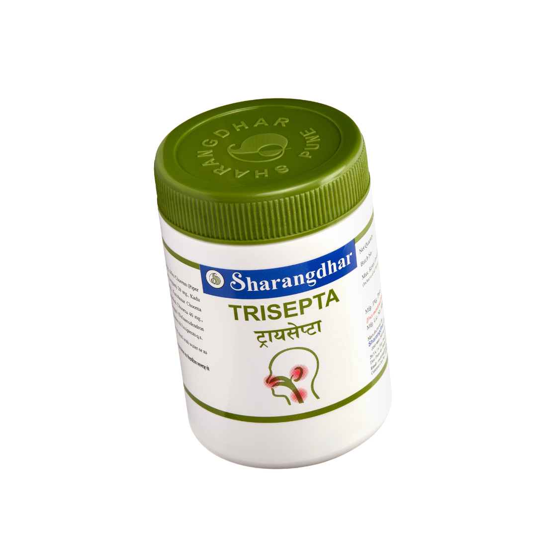 Information: Venturing out in the cold weather, roaming on the bike in the rainy and winter seasons without any protective gear, eating fried and sour foodstuffs and staying awake at night are all harmful for the body and affect the blood circulation by causing congestion. This results in internal swelling of the nose, ear and throat, change of voice, swelling of glands and joints. Trisepta consists of triphala powder, nimb, kanchanar, shuddha gandhak, tankan lahi & shuddha guggal that clears congestion & reduces swelling. Trisepta works on internal & external swelling.